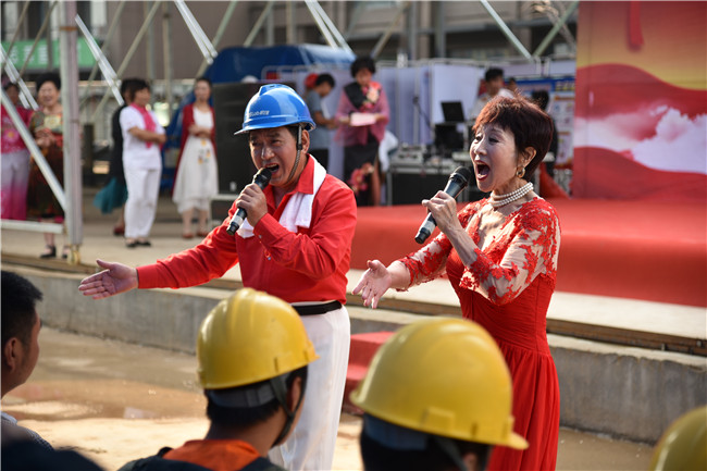 齐鲁晚报张刚大篷车兵妈妈公益艺术团分团——桃花盛开艺术团现场倾情助演。农民工兄弟辛苦劳作,建设美丽泉城,无数个日夜在异地他乡艰苦奋战,无法与家人团聚。值端午节到来之际,桃花盛开艺术团的艺术家们来到工地现场慰问演出,向农民工兄弟表达敬意,为工地现场百余名农民工兄弟们呈现了一场高质量、高水准、精彩纷呈的文艺演出,表演形式丰富多样,演出内容贴近生活、生动感人,现场气氛高涨、反响热烈。