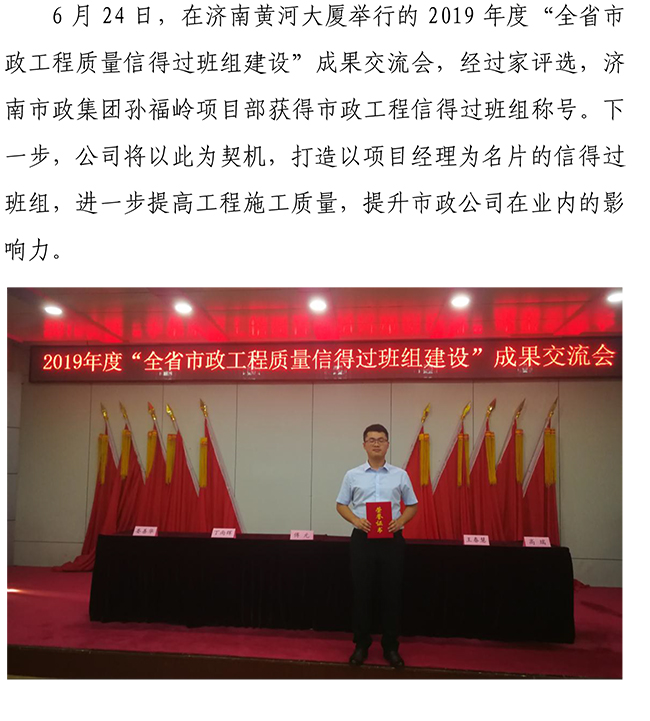 济南市政集团项目部获得山东省质量信得过班组