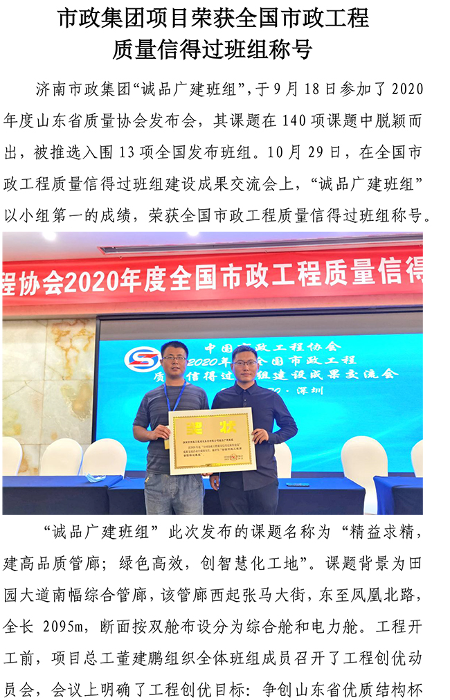 济南市政集团项目荣获全国市政工程质量信得过班组称号