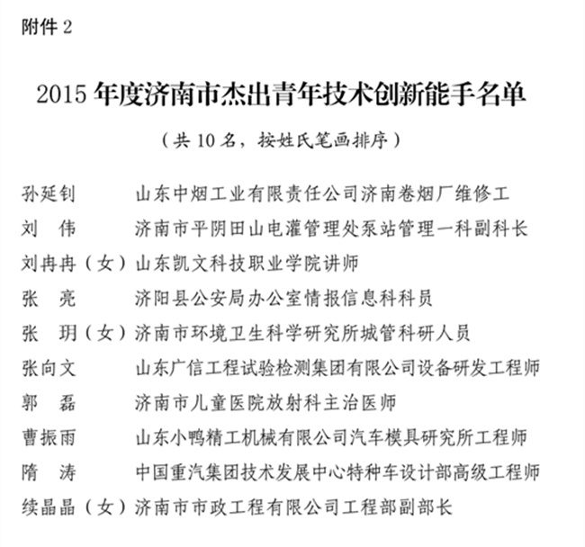 续晶晶荣获2015年度济南市“杰出青年技术创新能手”称号